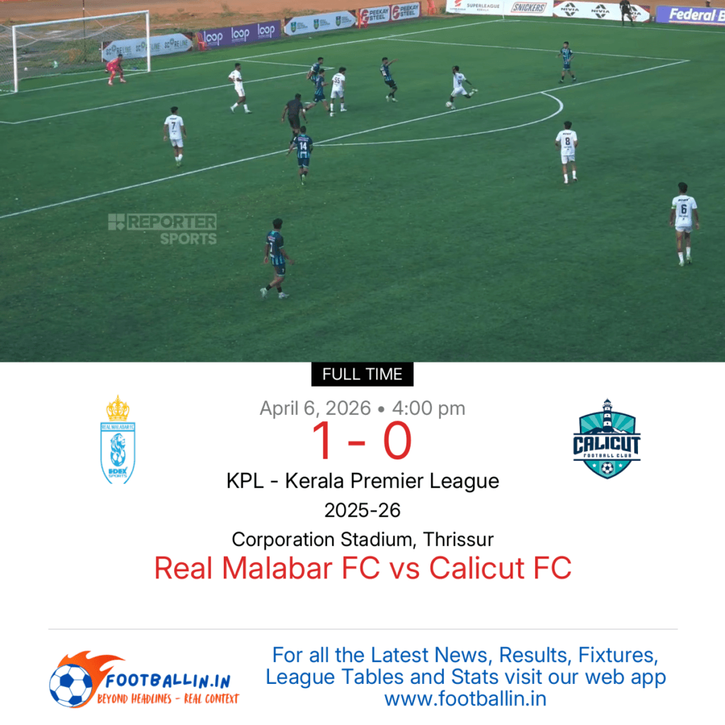 ⚽📊 League Table • Top Scorers • Statistics 📈⚽ Real Malabar FC defeated Calicut FC 1-0 on Apr 6, 2026 in the KPL – Kerala Premier League at Corporation Stadium, Thrissur, in a competitive clash. Arjun Raj struck the decisive goal in the 68’, securing the win for Real Malabar FC. #indianyouthfootball #indianfootball #indianwomenfootball #indianfootballleague […]