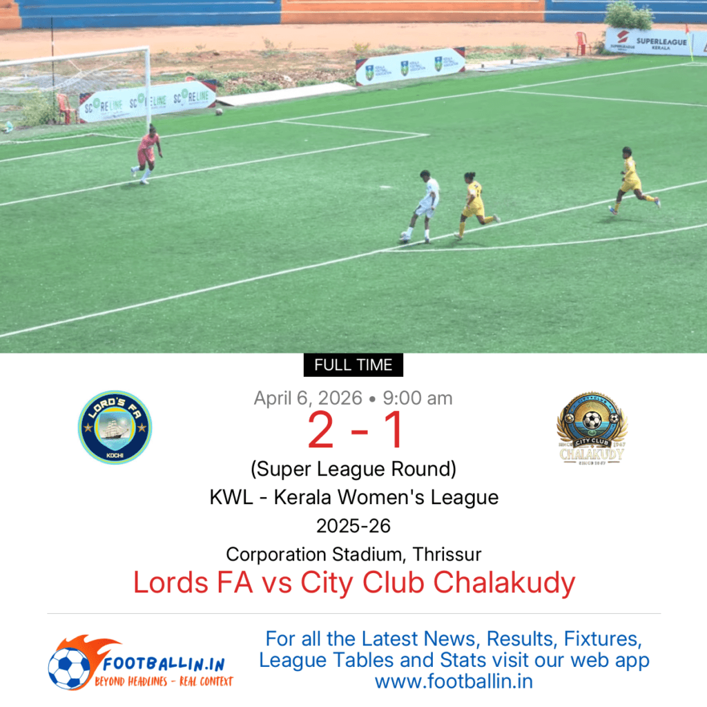⚽📊 League Table • Top Scorers • Statistics 📈⚽ Lords FA defeated City Club Chalakudy 2-1 on Apr 6, 2026 in the Super League Round of the KWL – Kerala Women's League at Corporation Stadium, Thrissur, in a closely-fought battle. Vyga Suresh put Lords FA in front in the 11’. Neha Saji further strengthened Lords […]