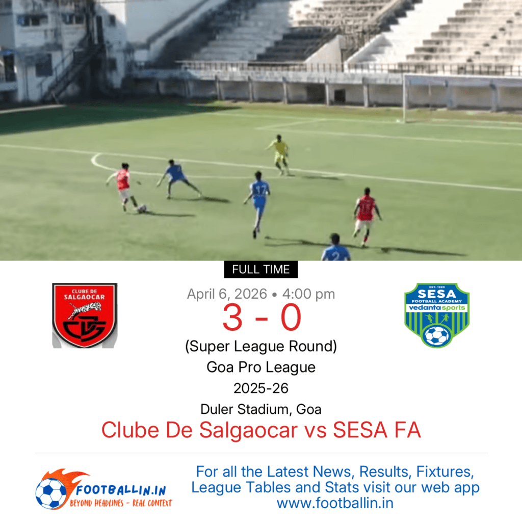 ⚽📊 League Table • Top Scorers • Statistics 📈⚽ Clube De Salgaocar defeated SESA FA 3-0 on Apr 6, 2026 in the Super League Round of the Goa Pro League at Duler Stadium, Goa, in a heavily favored encounter. Isac Zomuanpuia hit a fine brace for Clube De Salgaocar in 8’ and 44’. Joshua D’Silva […]