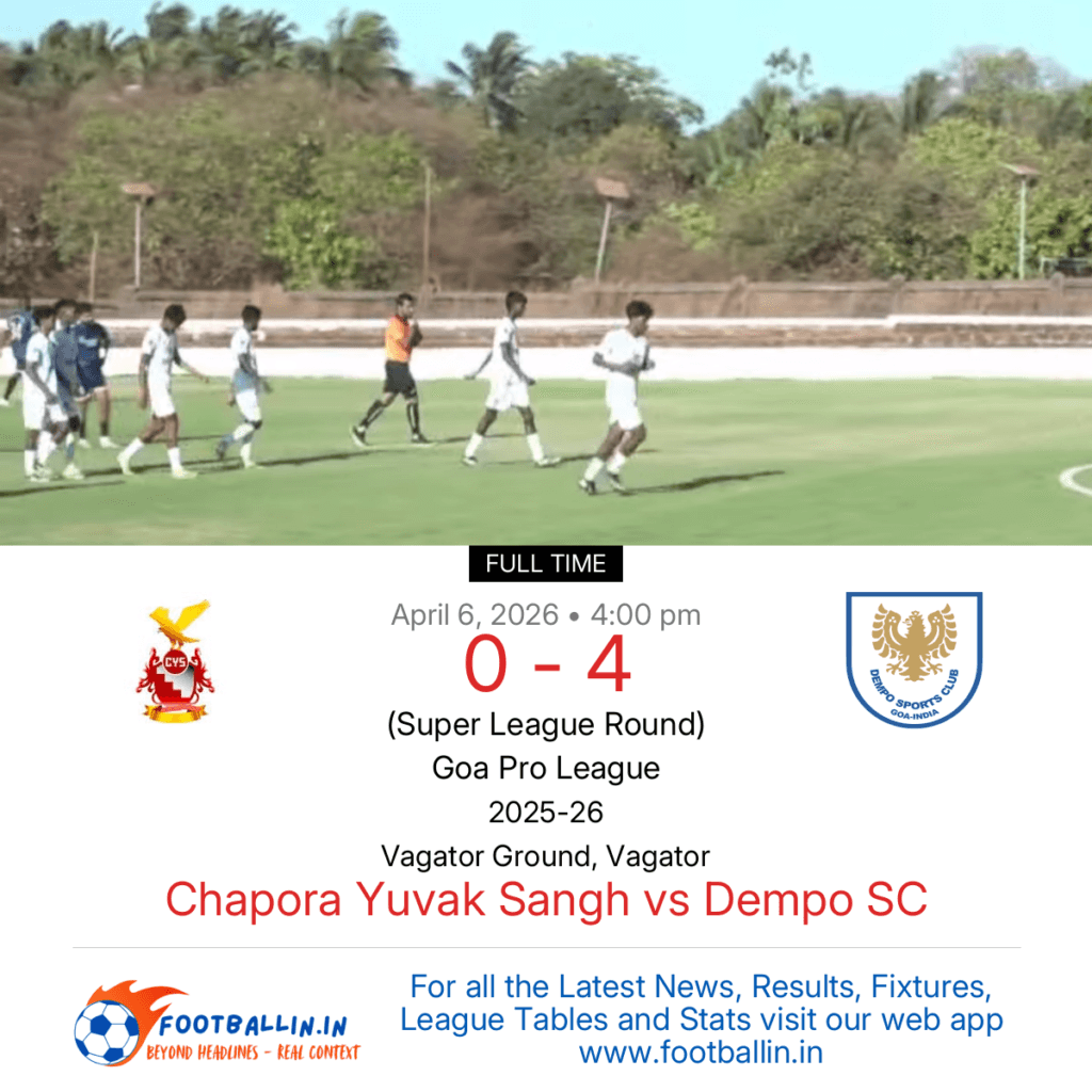 Dempo SC defeated Chapora Yuvak Sangh 4-0 on Apr 6, 2026 in the Super League Round of the Goa Pro League at Vagator Ground, Vagator, in a landslide win.