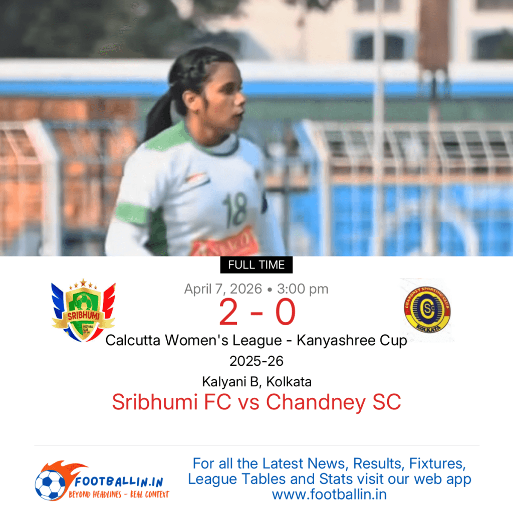 Sribhumi FC defeated Chandney SC 2-0 on Apr 7, 2026 in the Calcutta Women's League – Kanyashree Cup at Kalyani B, Kolkata, in a closely-fought battle.