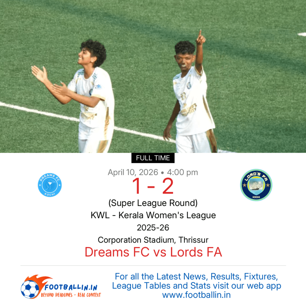 ⚽📊 League Table • Top Scorers • Statistics 📈⚽ Lords FA defeated Dreams FC 2-1 on Apr 10, 2026 in the Super League Round of the KWL – Kerala Women's League at Corporation Stadium, Thrissur, in a closely-fought battle. Neha Saji delivered a tidy double strike for Lords FA in 33’ and 51’. Sera M […]
