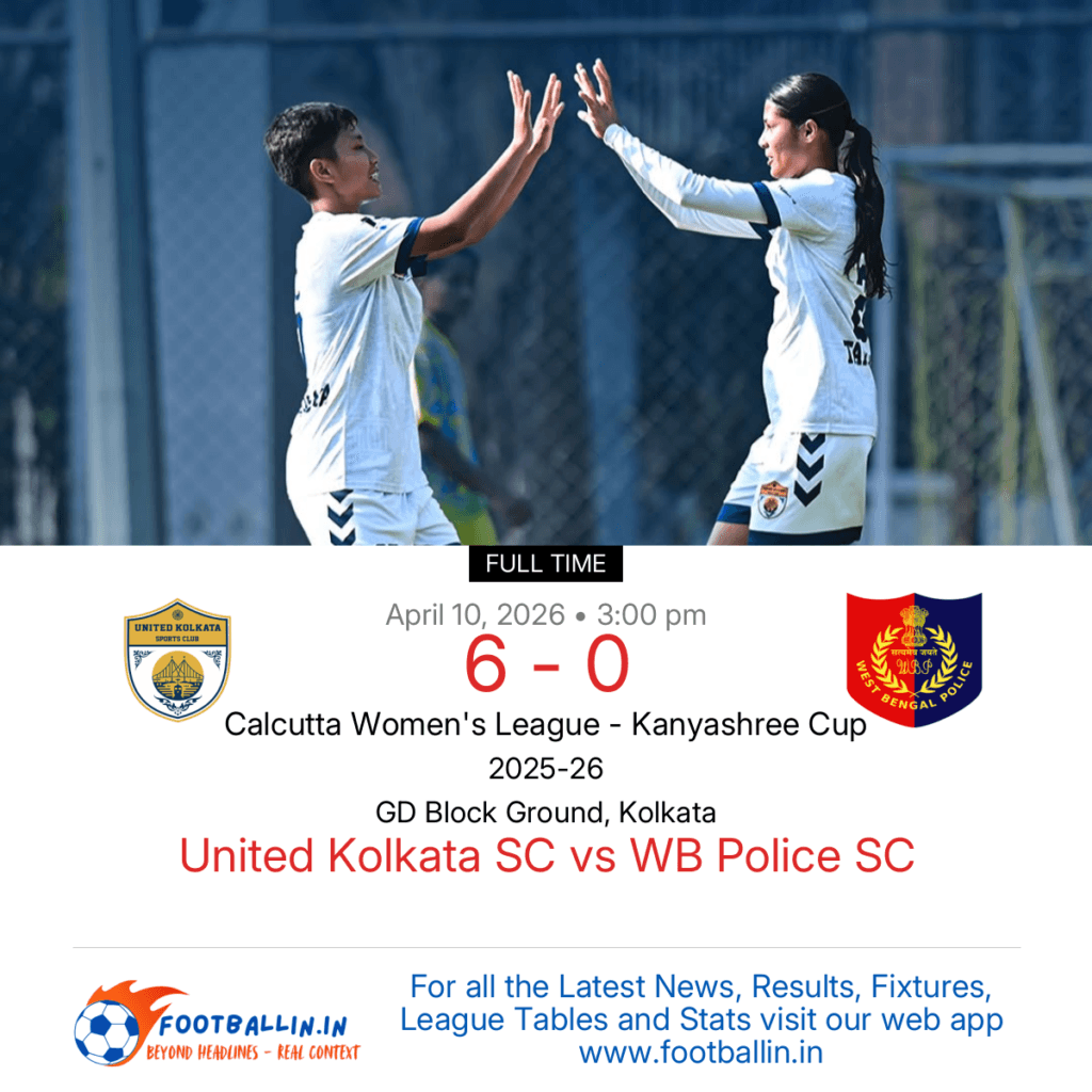 ⚽📊 League Table • Top Scorers • Statistics 📈⚽ United Kolkata SC defeated WB Police SC 6-0 on Apr 10, 2026 in the Calcutta Women's League – Kanyashree Cup at GD Block Ground, Kolkata, in a total rout. Kai Rumi put United Kolkata SC in front in the 16’. Nitu Linda hit a fine brace […]