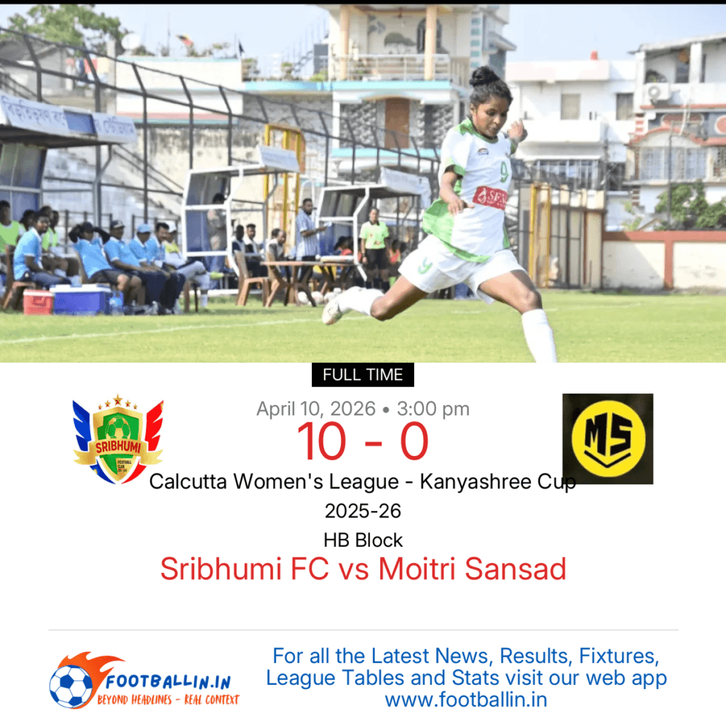 ⚽📊 League Table • Top Scorers • Statistics 📈⚽ Sribhumi FC defeated Moitri Sansad 10-0 on Apr 10, 2026 in the Calcutta Women’s League – Kanyashree Cup at HB Block, in a one-sided demolition. Mamata Mahata netted a memorable hat-trick for Sribhumi FC (19’, 23’, 39’). Singo Murmu struck a sharp double for Sribhumi FC […]