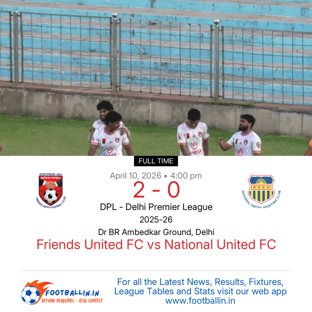 ⚽📊 League Table • Top Scorers • Statistics 📈⚽ Friends United FC defeated National United FC 2-0 on Apr 10, 2026 in the DPL – Delhi Premier League at Dr BR Ambedkar Ground, Delhi, in a tense encounter. Ramesh Chhetri put Friends United FC in front in the 67’. Ashutosh Singh made it more comfortable […]
