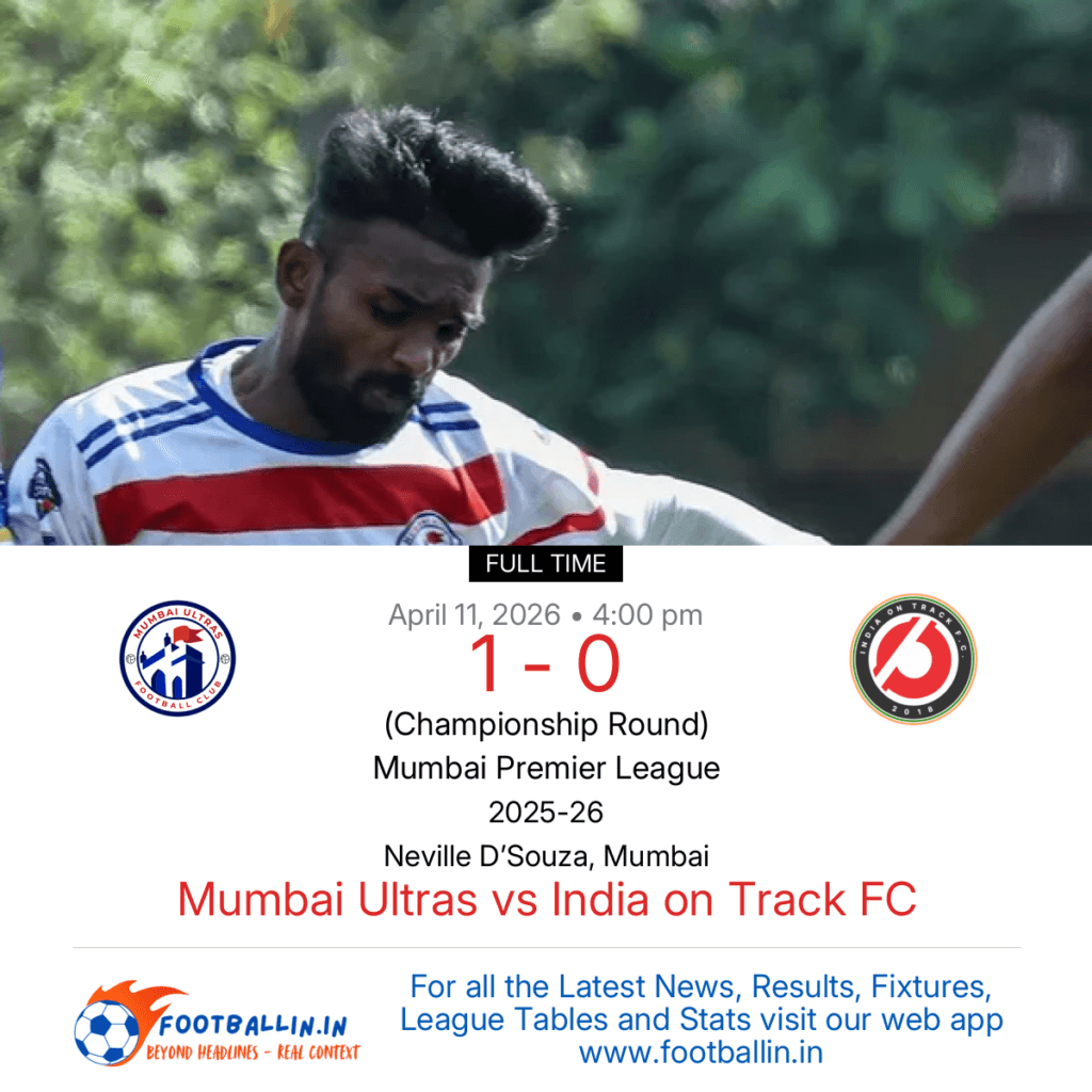 ⚽📊 League Table • Top Scorers • Statistics 📈⚽ Mumbai Ultras defeated India on Track FC 1-0 on Apr 11, 2026 in the Championship Round of the Mumbai Premier League at Neville D’Souza, Mumbai, in a tense encounter. Joyson Chettiar struck the decisive goal in the 52’, securing the win for Mumbai Ultras. #indianyouthfootball #indianfootball […]
