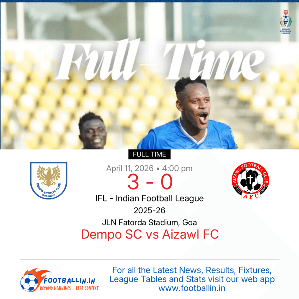 ⚽📊 League Table • Top Scorers • Statistics 📈⚽ Dempo SC defeated Aizawl FC 3-0 on Apr 11, 2026 in the IFL – Indian Football League at JLN Fatorda Stadium, Goa, in a heavily favored encounter. Marcus Leric Joseph in the 43’, Jose Luis M Pena in the 54’ and Sebastian G Atehortua in the […]