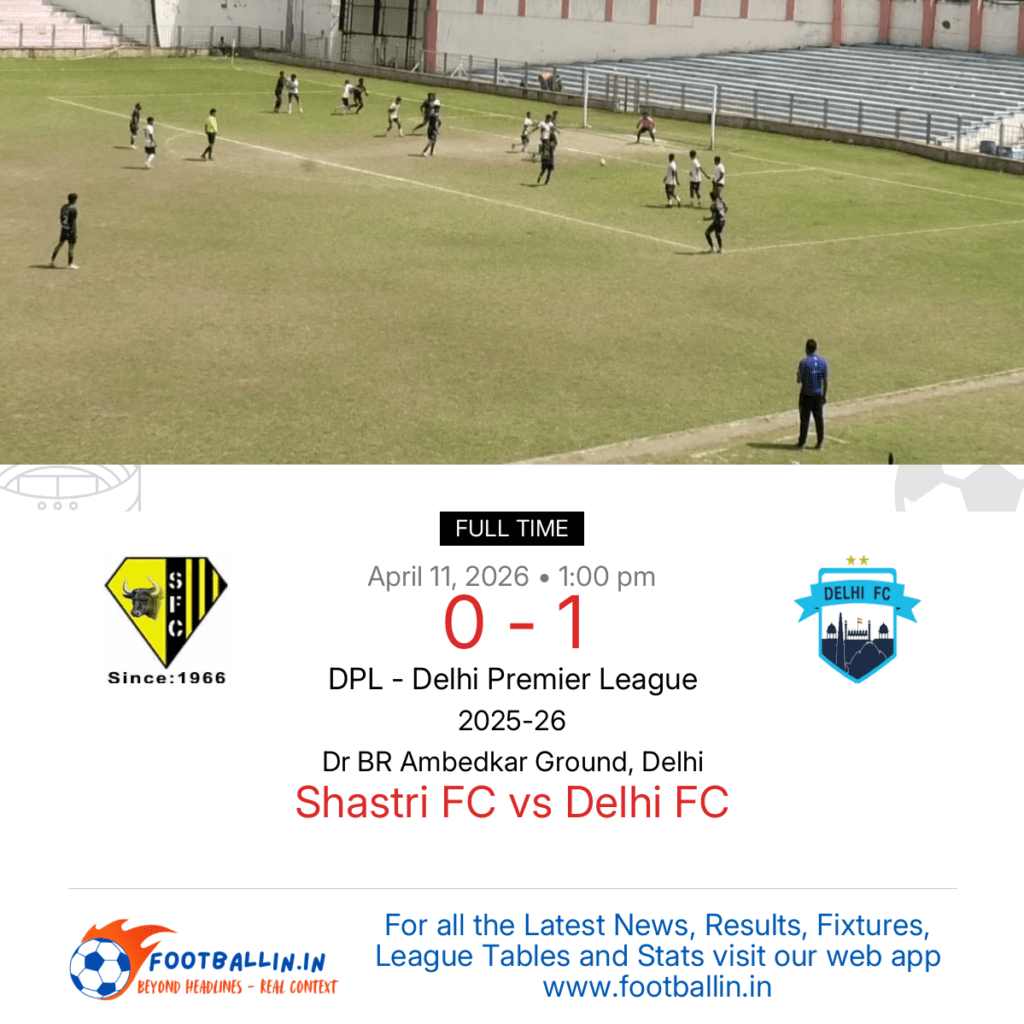 ⚽📊 League Table • Top Scorers • Statistics 📈⚽ Delhi FC defeated Shastri FC 1-0 on Apr 11, 2026 in the DPL – Delhi Premier League at Dr BR Ambedkar Ground, Delhi, in a tense encounter. Ayaan Shakeel struck the decisive goal from a free kick in the 43’, securing the win for Delhi FC. […]