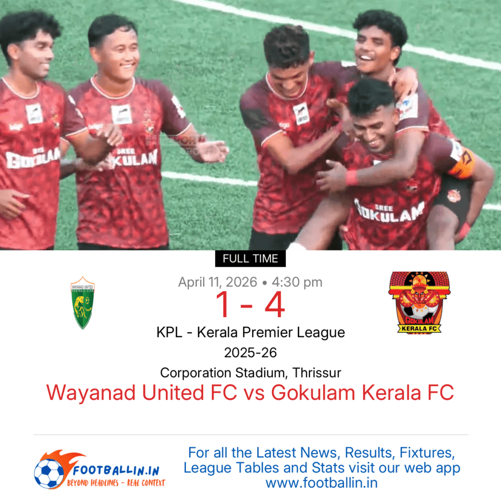 ⚽📊 League Table • Top Scorers • Statistics 📈⚽ Gokulam Kerala FC defeated Wayanad United FC 4-1 on Apr 11, 2026 in the KPL – Kerala Premier League at Corporation Stadium, Thrissur, in a convincing win. Muhammed Nihal levelled for Wayanad United FC in the 46’. Laishram Johnson Singh in the 28’, Jemsheed Ali in […]