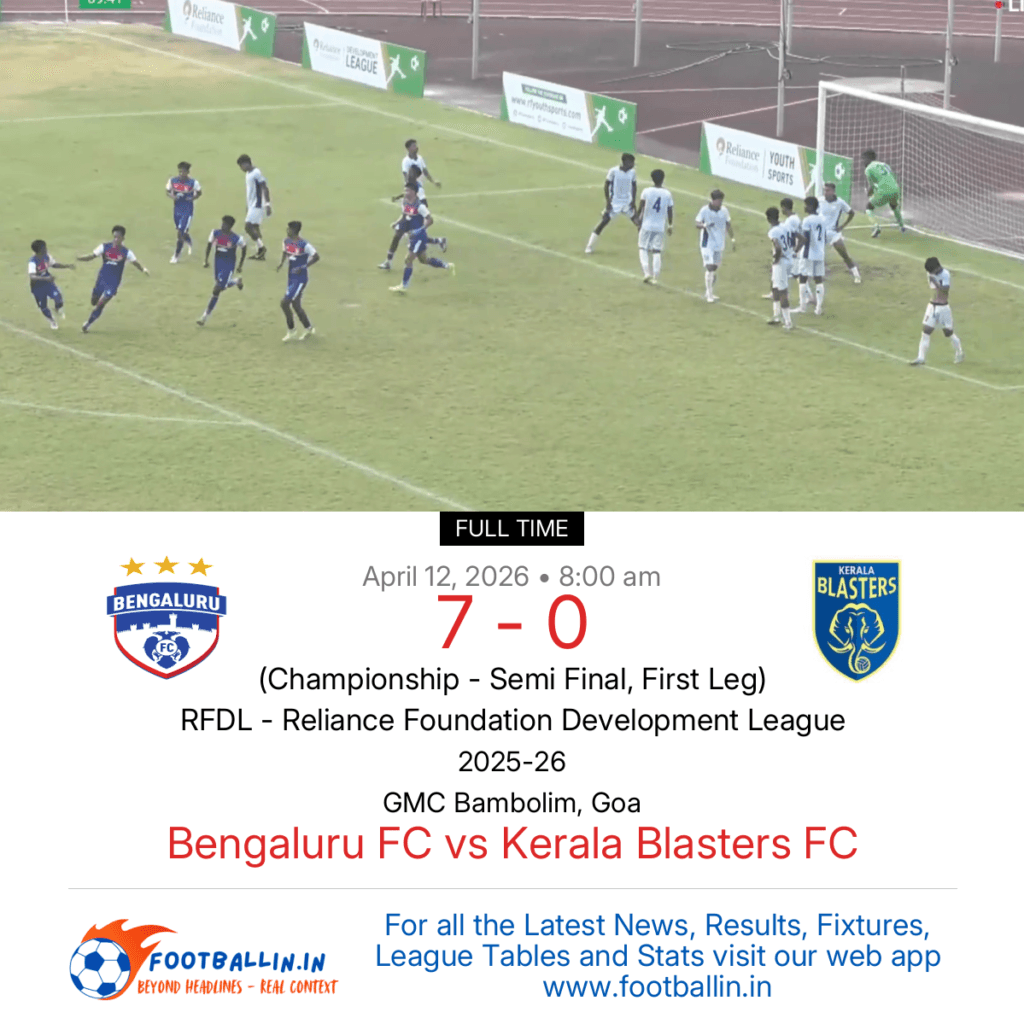 Bengaluru FC defeated Kerala Blasters FC 7-0 on Apr 12, 2026 in the Semi-Final of the RFDL – Reliance Foundation Development League at GMC Bambolim, Goa, in a one-sided demolition.