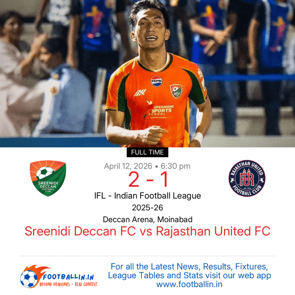 Sreenidi Deccan FC defeated Rajasthan United FC 2-1 on Apr 12, 2026 in the IFL – Indian Football League at Deccan Arena, Moinabad, in a competitive clash.