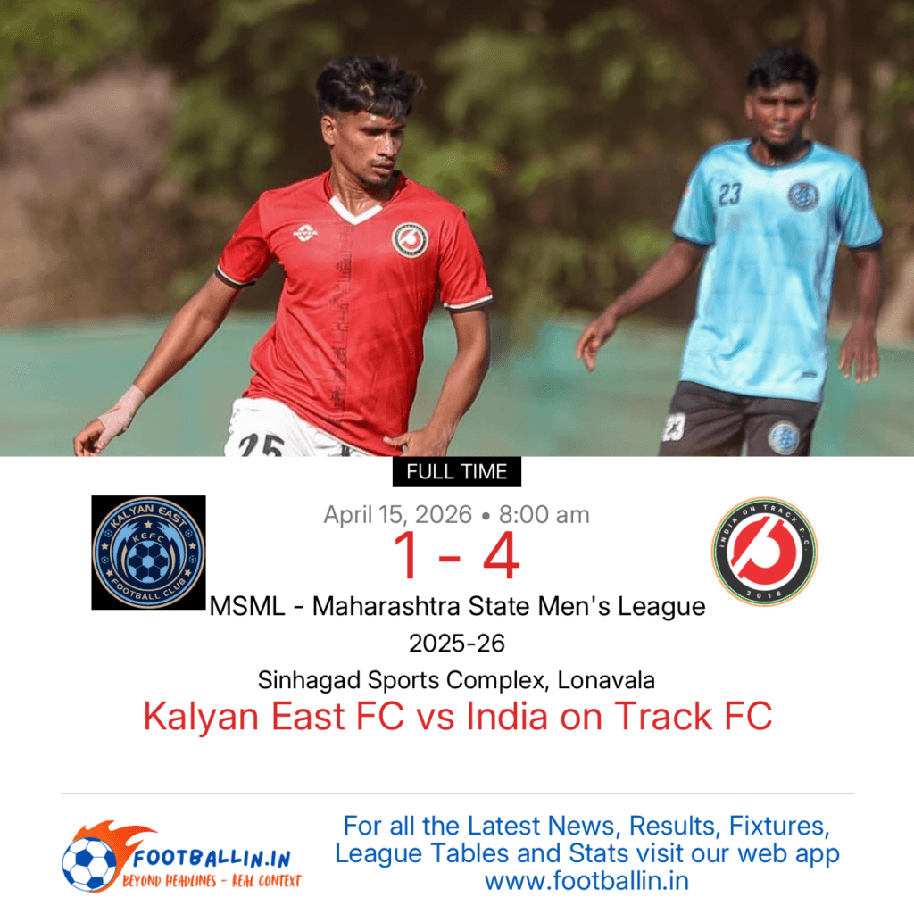 India on Track FC defeated Kalyan East FC 4-1 on Apr 15, 2026 in the MSML – Maharashtra State Men’s League at Sinhagad Sports Complex, Lonavala, in a heavily favored encounter.
