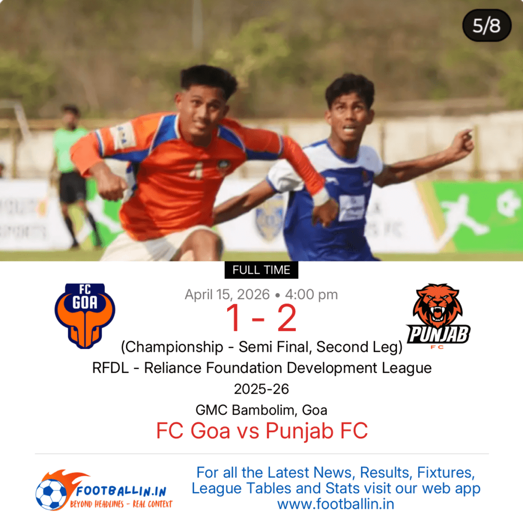 Punjab FC defeated FC Goa 2-1 on Apr 15, 2026 in the Semi-Final(Second Leg) of the RFDL – Reliance Foundation Development League at GMC Bambolim, Goa, in a tense encounter.