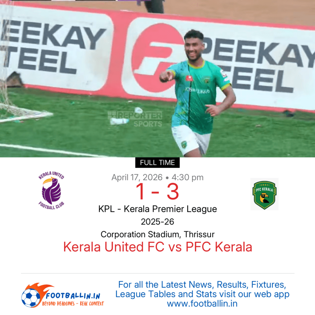 PFC Kerala defeated Kerala United FC 3-1 on Apr 17, 2026 in the KPL – Kerala Premier League at Corporation Stadium, Thrissur, in a tense encounter.