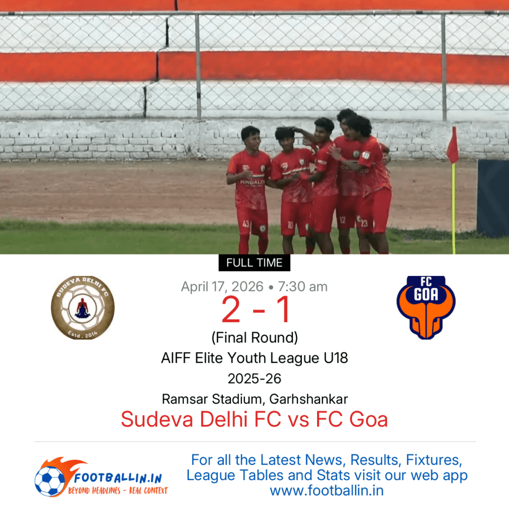 Sudeva Delhi FC defeated FC Goa 2-1 on Apr 17, 2026 in the Final of the AIFF Elite Youth League U18 at Ramsar Stadium, Garhshankar, in a competitive clash.