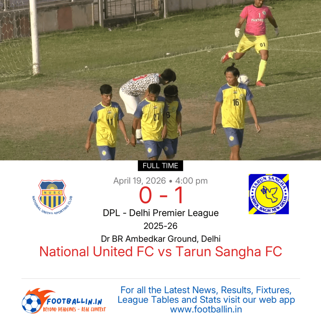 Tarun Sangha FC defeated National United FC 1-0 on Apr 19, 2026 in the DPL – Delhi Premier League at Dr BR Ambedkar Ground, Delhi, in a closely-fought battle.