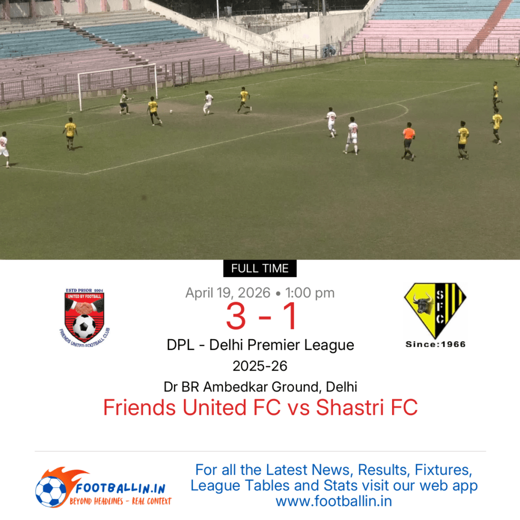 Friends United FC defeated Shastri FC 3-1 on Apr 19, 2026 in the DPL – Delhi Premier League at Dr BR Ambedkar Ground, Delhi, in a closely-fought battle.