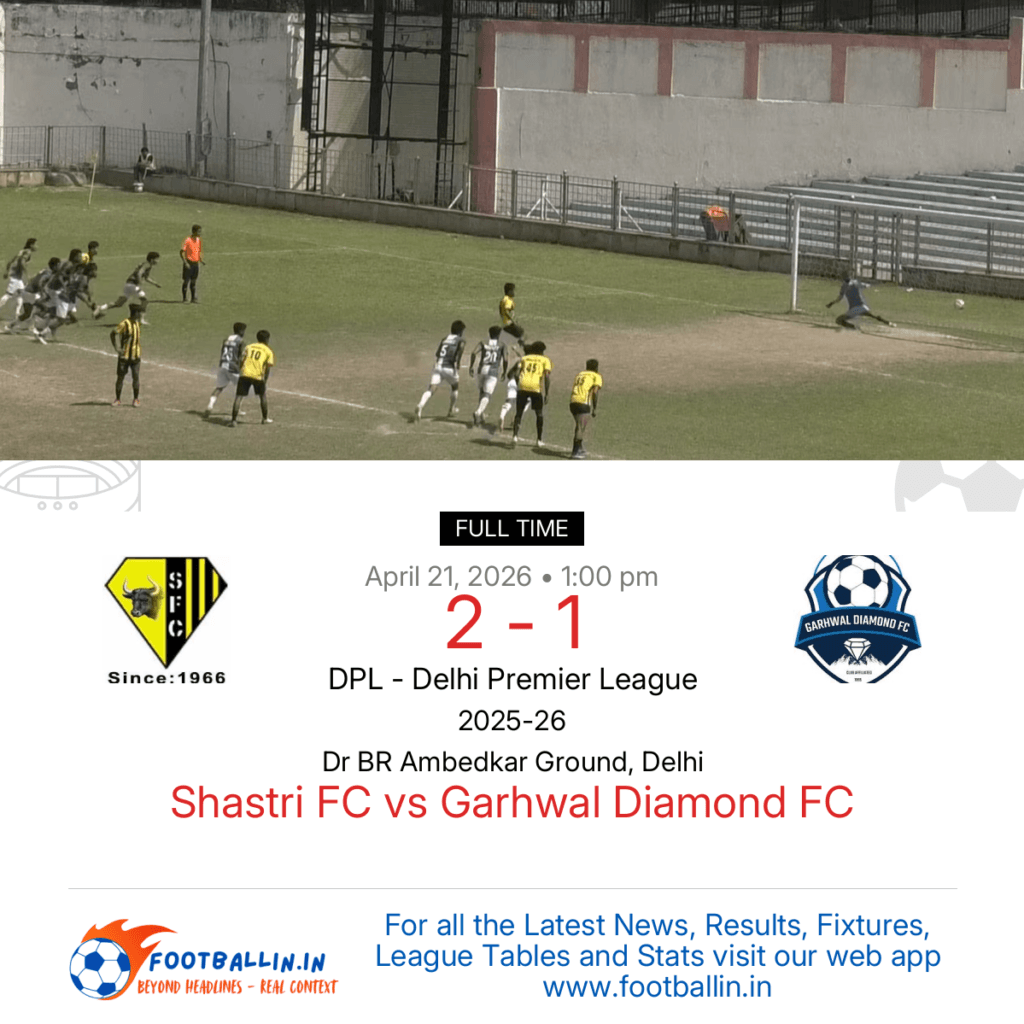 ⚽📊 League Table • Top Scorers • Statistics 📈⚽ Shastri FC defeated Garhwal Diamond FC 2-1 on Apr 21, 2026 in the DPL – Delhi Premier League at Dr BR Ambedkar Ground, Delhi, in a closely-fought battle. Sachin put Garhwal Diamond FC in front in the 30’. Yumnam Joychandra brought Shastri FC back on level […]