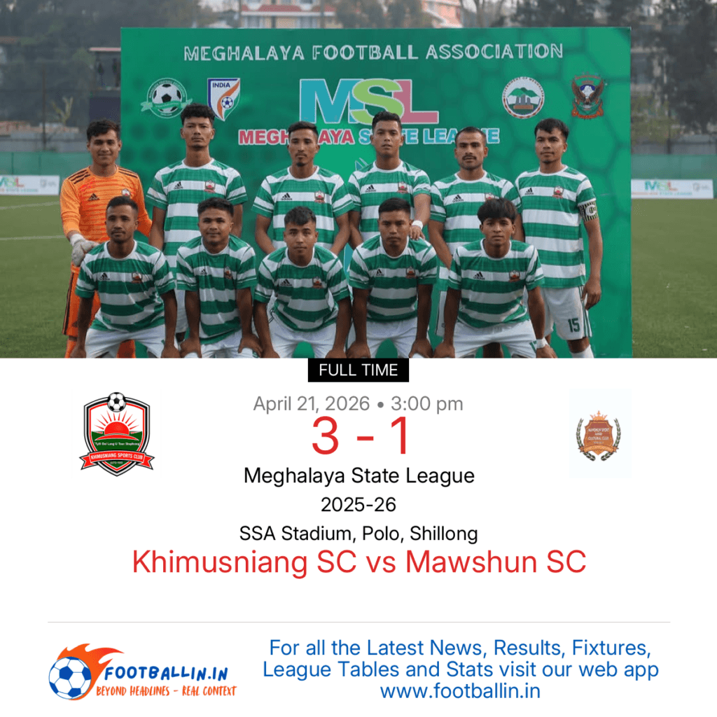 ⚽📊 League Table • Top Scorers • Statistics 📈⚽ Khimusniang SC defeated Mawshun SC 3-1 on Apr 21, 2026 in the Meghalaya State League at SSA Stadium, Polo, Shillong, in a hard-fought match. Archangel Khongtyngkut put Mawshun SC in front in the 31’. Civility Khongmalai brought Khimusniang SC back on level terms in the 33’. […]