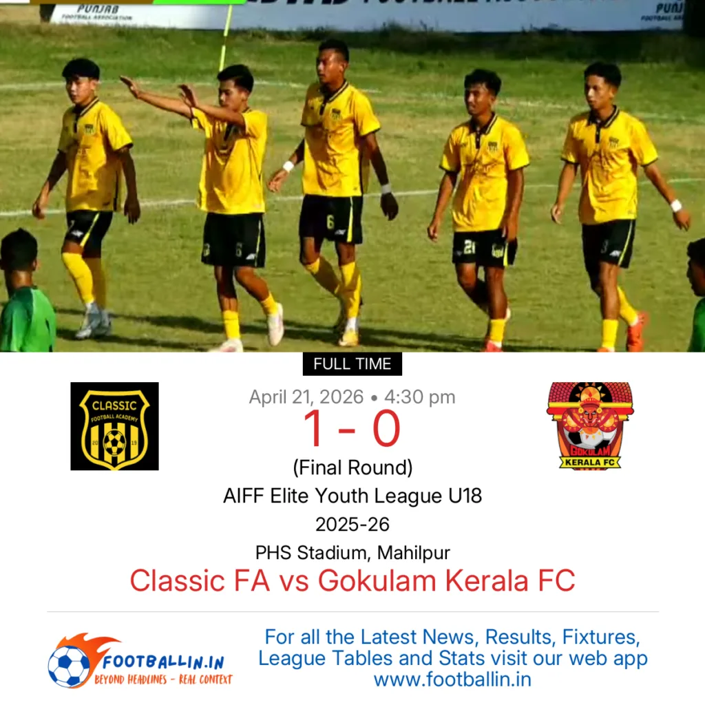 Classic FA defeated Gokulam Kerala FC 1-0 on Apr 21, 2026 in the Final Round of the AIFF Elite Youth League U18 at PHS Stadium, Mahilpur, in a closely-fought battle.