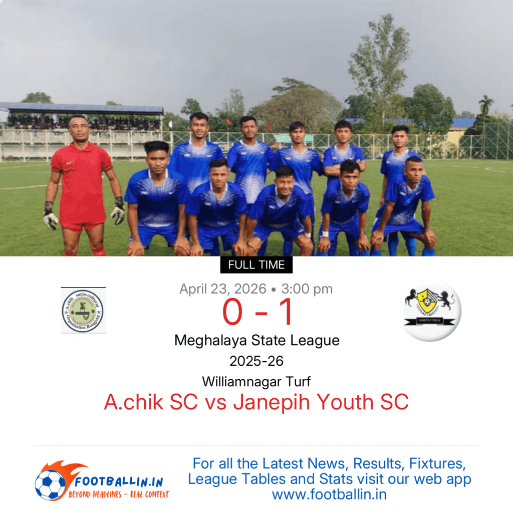 Janepih Youth SC defeated A.chik SC 1-0 on Apr 23, 2026 in the Meghalaya State League at Williamnagar Turf, in a hard-fought match.