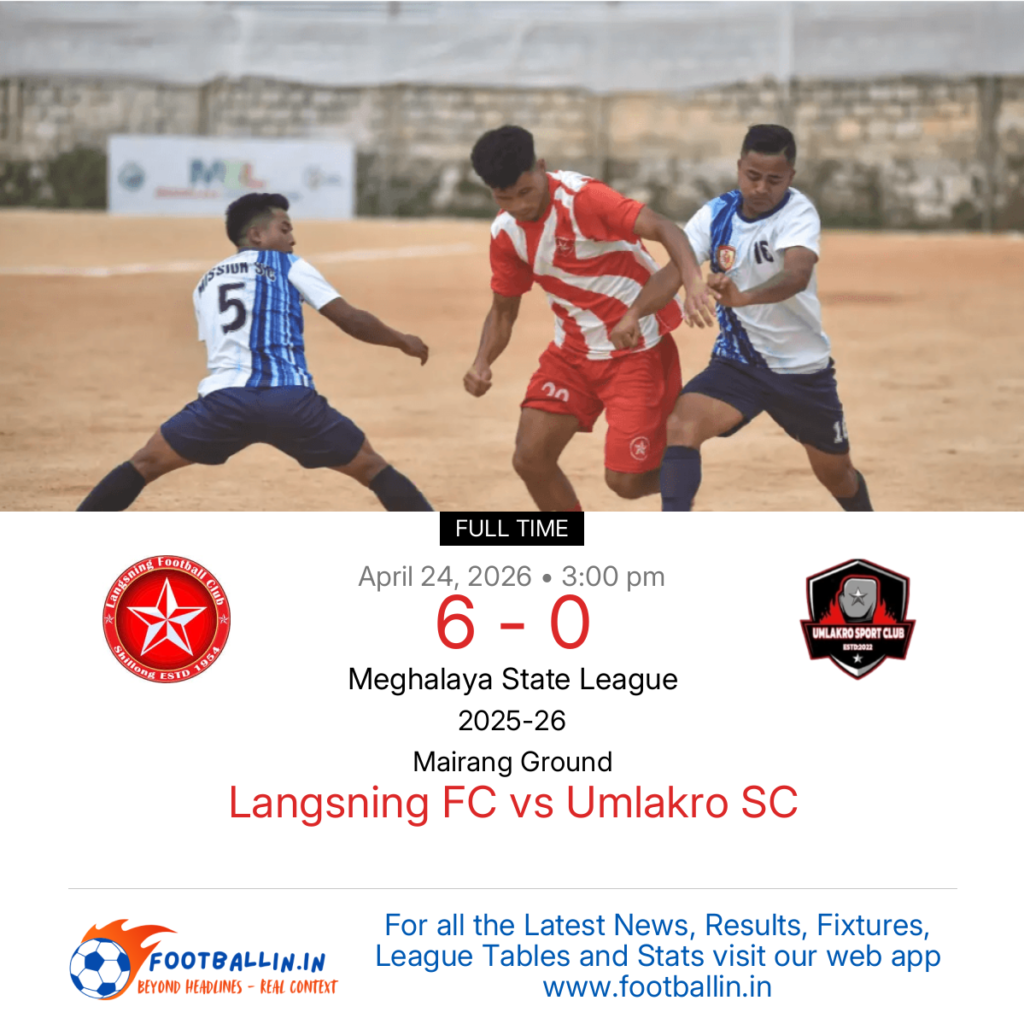 Langsning FC defeated Umlakro SC 6-0 on Apr 24, 2026 in the Meghalaya State League at Mairang Ground, in a total rout.
