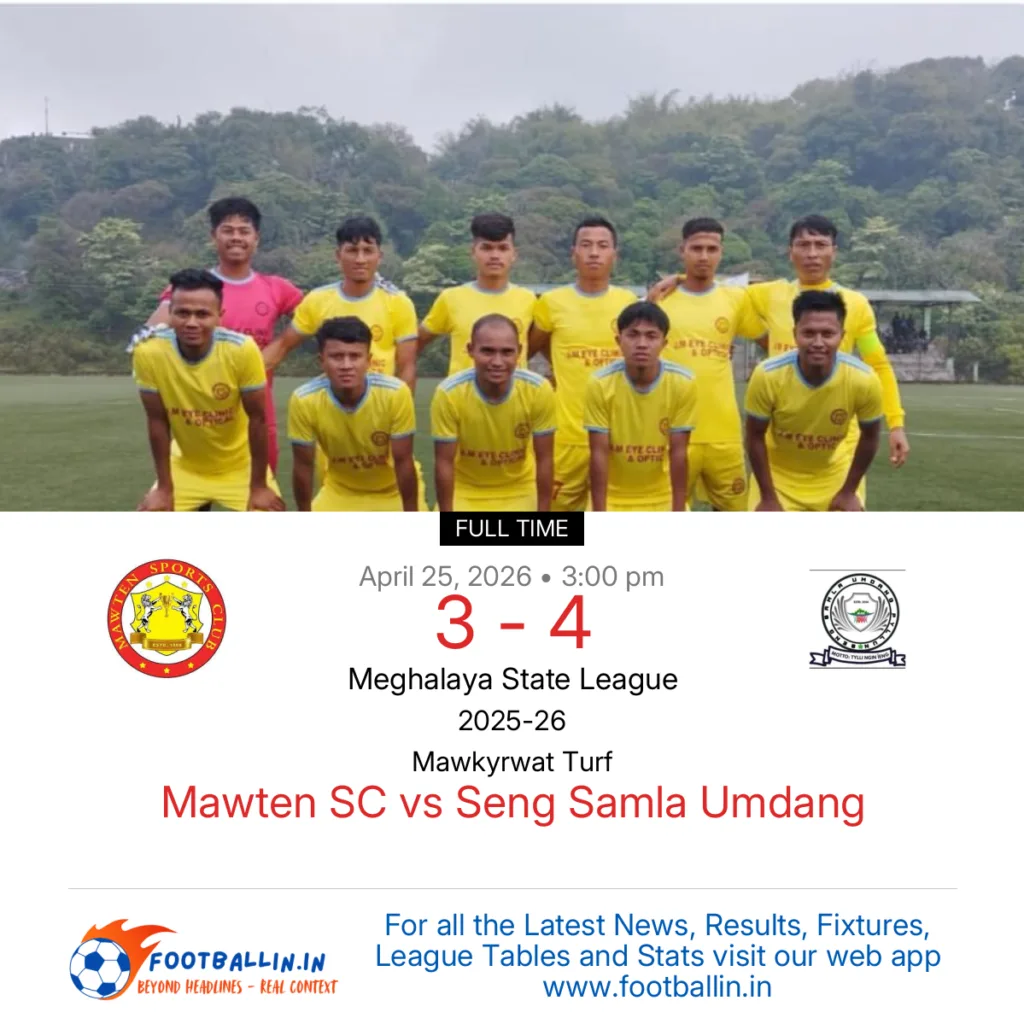 Seng Samla Umdang defeated Mawten SC 4-3 on Apr 25, 2026 in the Meghalaya State League at Mawkyrwat Turf, in a hard-fought match.