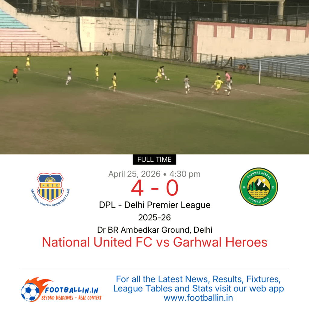 National United FC defeated Garhwal Heroes 4-0 on Apr 25, 2026 in the DPL – Delhi Premier League at Dr BR Ambedkar Ground, Delhi, in a landslide win.