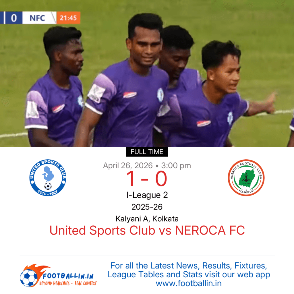 League Table • Results & Fixtures • Top Scorers United Sports Club defeated NEROCA FC 1-0 on Apr 26, 2026 in the I-League 2 at Kalyani A, Kolkata, in a closely-fought battle. Sumay Shome struck the decisive goal in the 22’, securing the win for United Sports Club. #indianyouthfootball #indianfootball #indianwomenfootball #indianfootballleague #footballin #ileague2 #unitedsportsclub […]