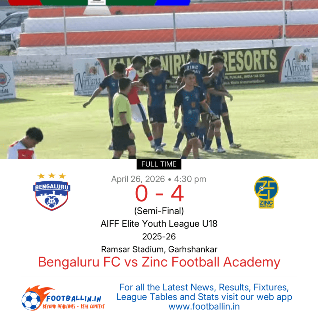 League Table • Results & Fixtures • Top Scorers Zinc Football Academy defeated Bengaluru FC 4-0 and storm into Final, on Apr 26, 2026 in the Semi-Final of the AIFF Elite Youth League U18 at Ramsar Stadium, Garhshankar, in a one-sided demolition. Yash Sahani in the 13’, Ashish Chetry in the 34’, Himanshu in the […]