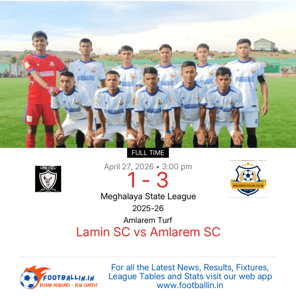 Amlarem SC defeated Lamin SC 3-1 on Apr 27, 2026 in the Meghalaya State League at Amlarem Turf, in a hard-fought match.