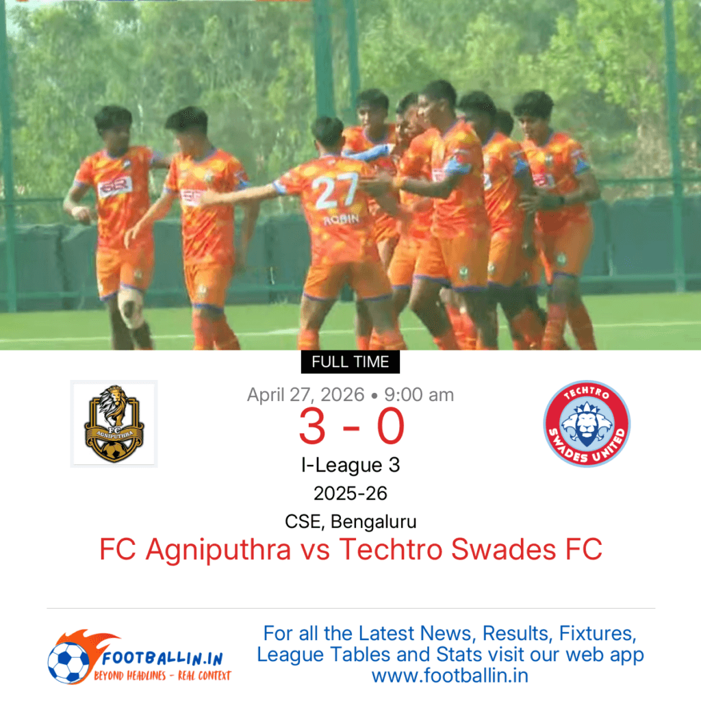 FC Agniputhra defeated Techtro Swades FC 3-0 on Apr 27, 2026 in the I-League 3 at CSE, Bengaluru, in a commanding display.