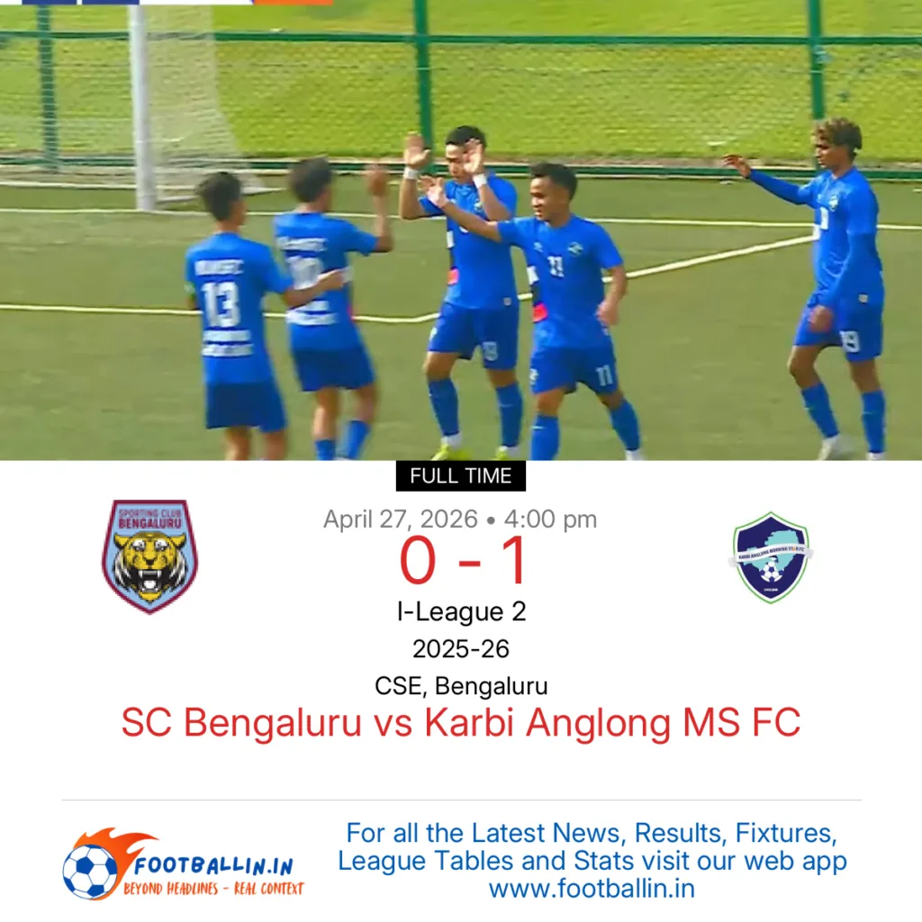 Karbi Anglong MS FC defeated SC Bengaluru 1-0 on Apr 27, 2026 in the I-League 2 at CSE, Bengaluru, in a tense encounter.