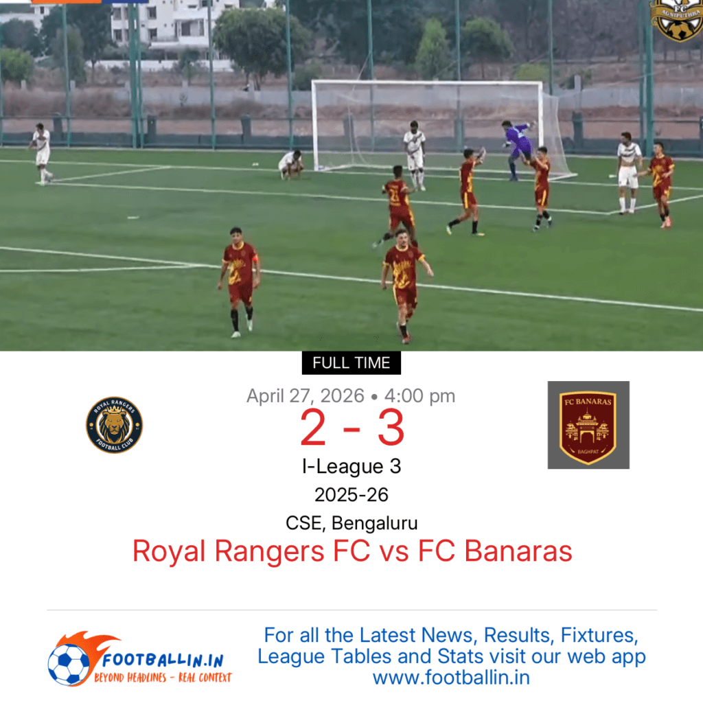 FC Banaras defeated Royal Rangers FC 3-2 on Apr 27, 2026 in the I-League 3 at CSE, Bengaluru, in a hard-fought match.