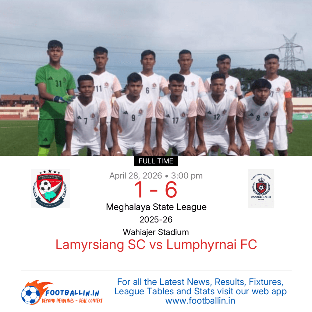Lumphyrnai FC defeated Lamyrsiang SC 6-1 on Apr 28, 2026 in the Meghalaya State League at Wahiajer Stadium, in a one-sided demolition.