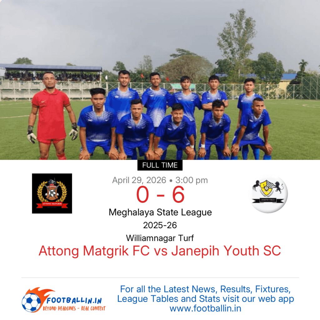 Janepih Youth SC defeated Attong Matgrik FC 6-0 on Apr 29, 2026 in the Meghalaya State League at Williamnagar Turf, in a landslide win.
