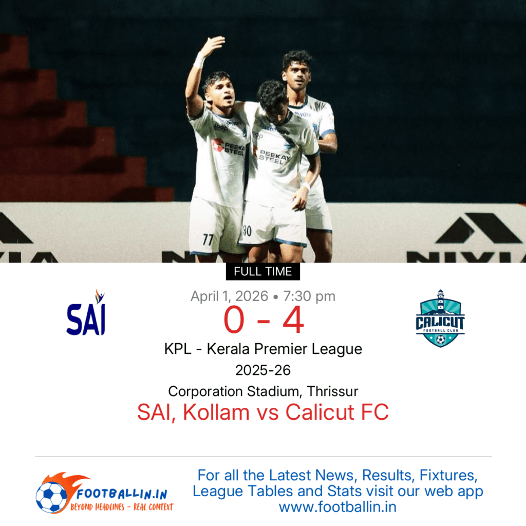 ⚽📊 League Table • Top Scorers • Statistics 📈⚽ Calicut FC defeated SAI, Kollam 4-0 on Apr 1, 2026 in the KPL – Kerala Premier League at Corporation Stadium, Thrissur, in a one-sided demolition. Shamnad K P scored a brace for Calicut FC in 8’ and 42’. Muhammed Roshal extended Calicut FC's lead in the […]