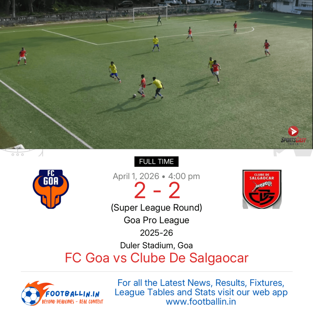 ⚽📊 League Table • Top Scorers • Statistics 📈⚽ FC Goa and Clube De Salgaocar drew 2-2 on Apr 1, 2026 in the Super League Round of the Goa Pro League at Duler Stadium, Goa, after a tight, well-balanced contest. Selwyn Frazier Miranda put Clube De Salgaocar in front in the 37’. Konsam Akash Singh […]