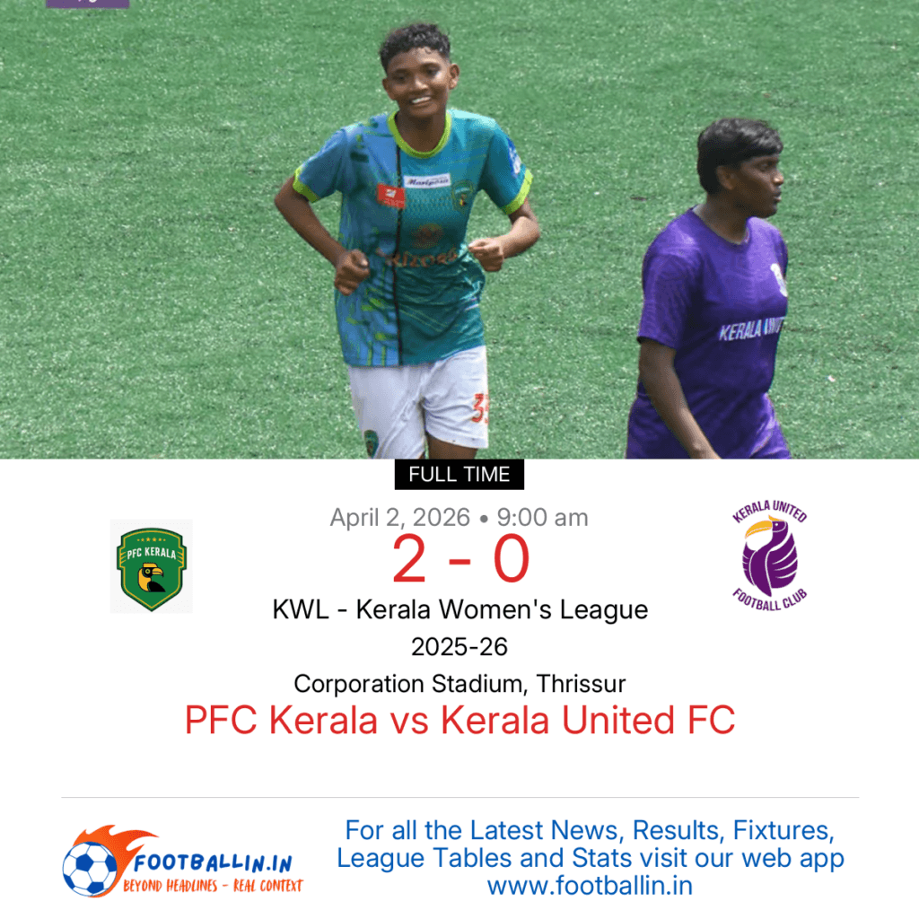 ⚽📊 League Table • Top Scorers • Statistics 📈⚽ PFC Kerala defeated Kerala United FC 2-0 on Apr 2, 2026 in the KWL – Kerala Women's League at Corporation Stadium, Thrissur, in a tense encounter. Khushi Chandel put PFC Kerala in front in the 58’. Meenakshi D added to PFC Kerala's advantage in the 90+1’. […]