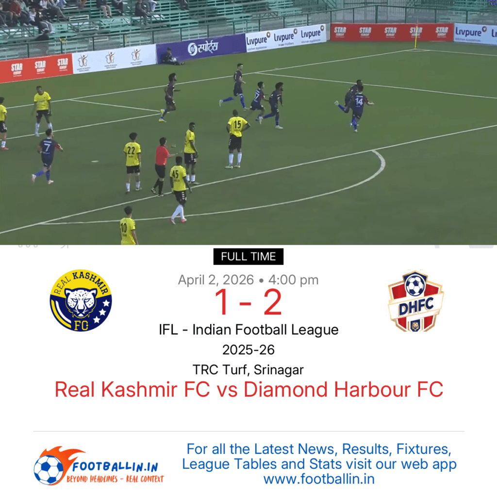 ⚽📊 League Table • Top Scorers • Statistics 📈⚽ Diamond Harbour FC defeated Real Kashmir FC 2-1 on Apr 2, 2026 in the IFL – Indian Football League at TRC Turf, Srinagar, in a competitive clash. Hugo D Rodriguez put Diamond Harbour FC in front in the 55’. Djakaridja G Traore equalised for Real Kashmir […]
