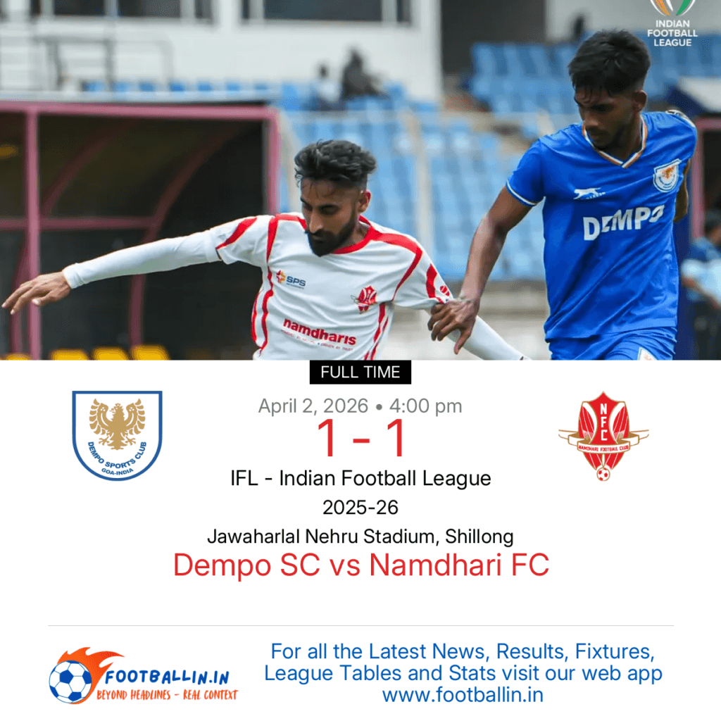⚽📊 League Table • Top Scorers • Statistics 📈⚽ Dempo SC and Namdhari FC drew 1-1 on Apr 2, 2026 in the IFL – Indian Football League at Jawaharlal Nehru Stadium, Shillong, after a hard-fought stalemate. Marcus Leric Joseph put Dempo SC in front in the 8’. Khangembam Bidyashagar Singh brought Namdhari FC back on […]
