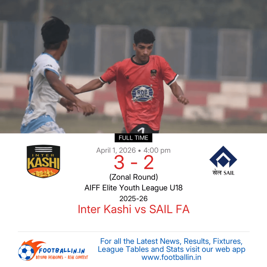 ⚽📊 League Table • Top Scorers • Statistics 📈⚽ Inter Kashi defeated SAIL FA 3-2 on Apr 1, 2026 in the Zonal Round of the AIFF Elite Youth League U18, in a closely-fought battle. Yaman Sheoran produced a superb hat-trick for Inter Kashi (25’, 59’, 70’). Tushar Bepari brought SAIL FA back on level terms […]