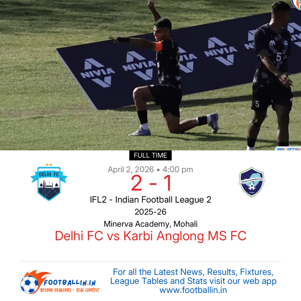 ⚽📊 League Table • Top Scorers • Statistics 📈⚽ Delhi FC defeated Karbi Anglong MS FC 2-1 on Apr 2, 2026 in the IFL2 – Indian Football League 2 at Minerva Academy, Mohali, in a hard-fought match. Himanshu Jangra produced a clinical brace for Delhi FC in 6’ and 15’. Khupminlun gave Karbi Anglong MS […]