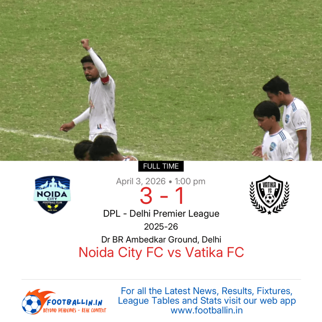 ⚽📊 League Table • Top Scorers • Statistics 📈⚽ Noida City FC defeated Vatika FC 3-1 on Apr 3, 2026 in the DPL – Delhi Premier League at Dr BR Ambedkar Ground, Delhi, in a tense encounter. Piyush Bhandari produced a clinical brace for Noida City FC in 37’ and 69’. Gurjinder Kumar added to […]