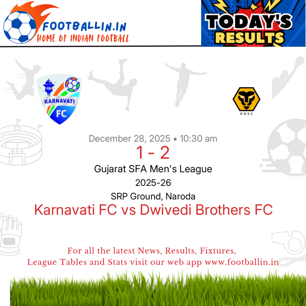 Dwivedi Brothers FC defeated Karnavati FC 2-1 on Dec 28, 2025 in the Gujarat SFA Men's League at SRP Ground, Naroda, in a tense encounter. Mo Morish put Dwivedi Brothers FC in front in the 23’. Suryodaya Dwivedi further strengthened Dwivedi Brothers FC's position in the 42’. Chiranjeeb Patra reduced the deficit for Karnavati FC […]